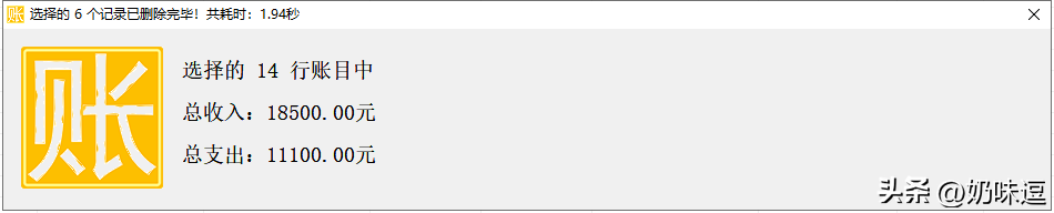 支持自动统计当前记录的总收入、总支出、结余以及单笔结余的金额