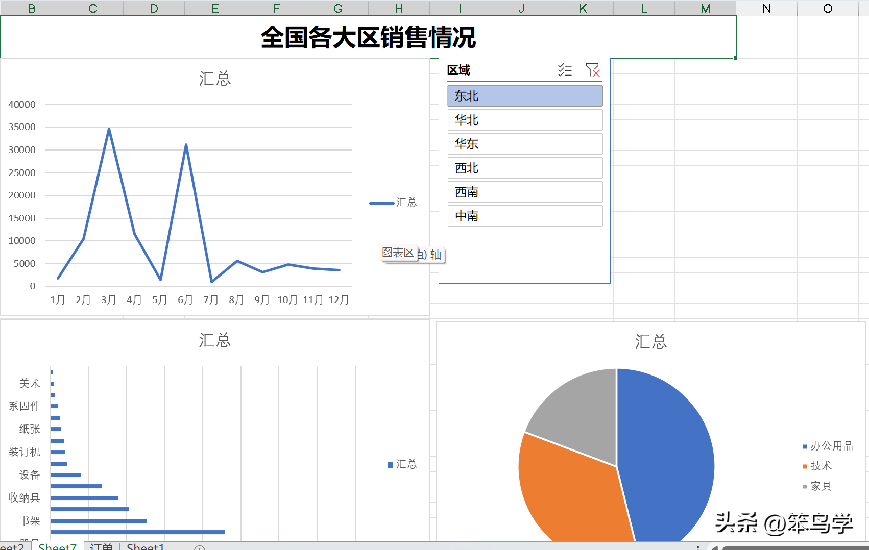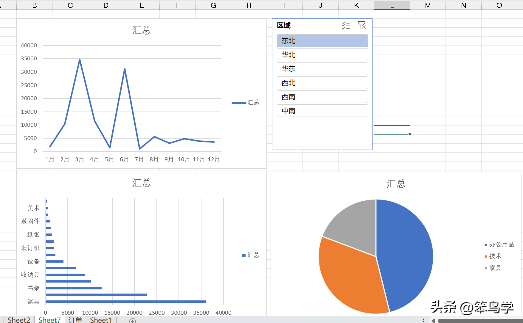 按照同样的方式,对第二个数据透视表插入一个饼图,对第三个数据透视表插入一个条形图,如下图所示。