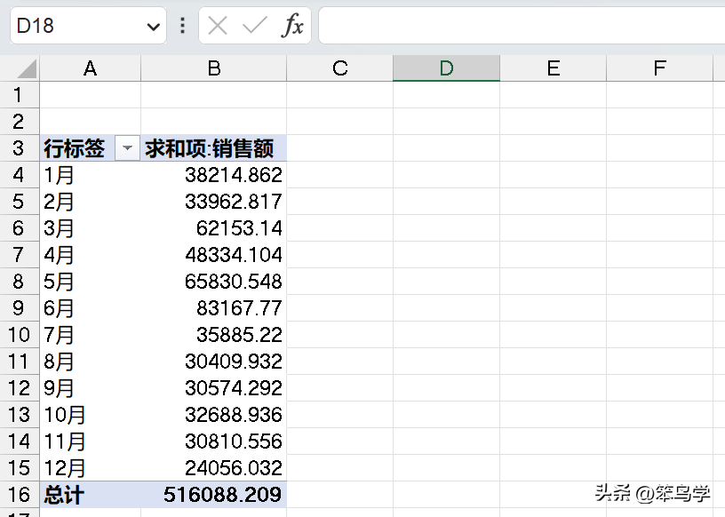 首先,用数据透视表统计出分月销售额,如下图所示。