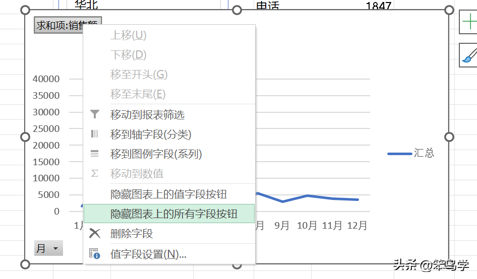 在图表上右击鼠标,选择“隐藏图表上的所有字段按钮”,将灰色的按钮都隐藏。