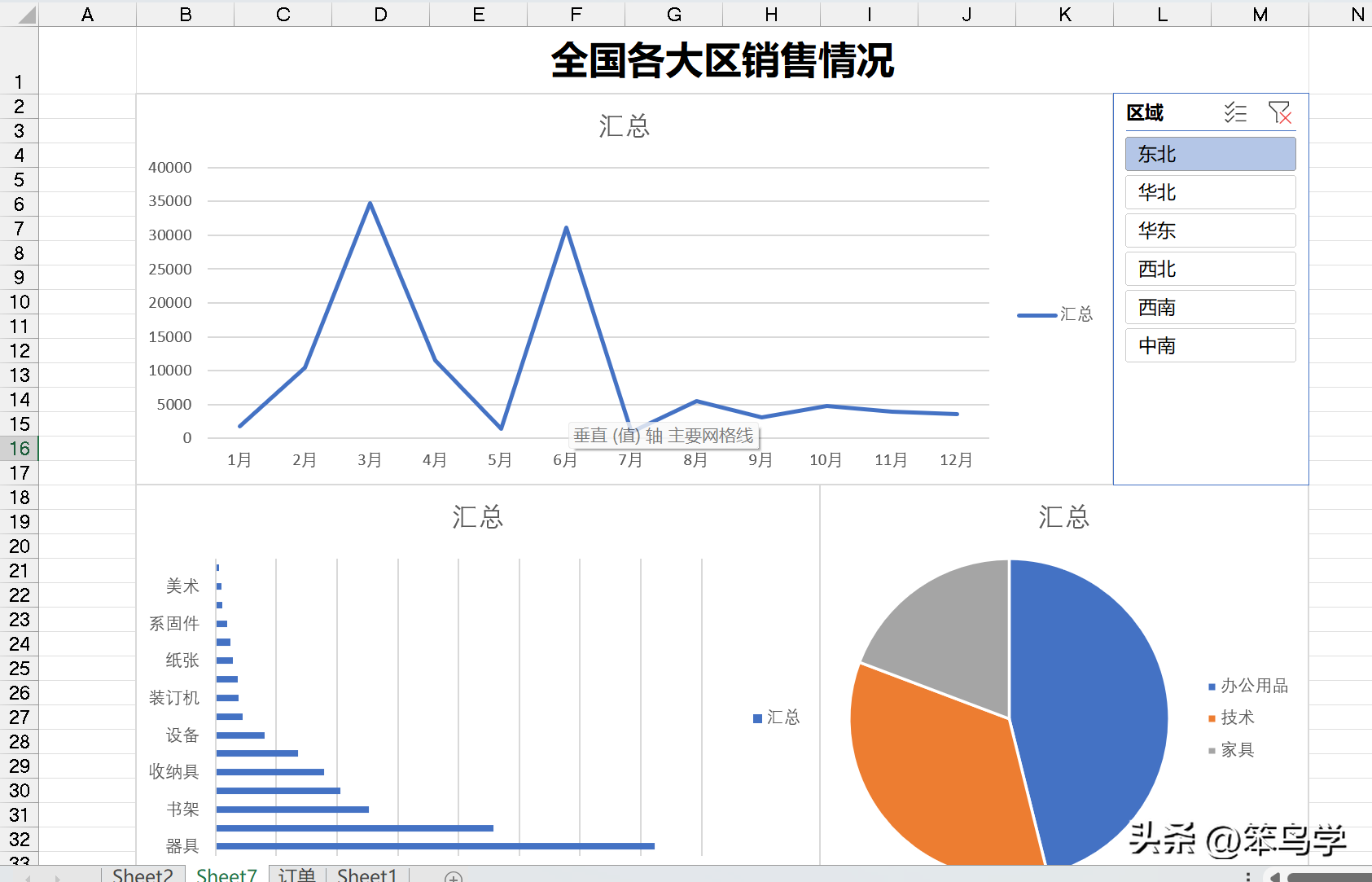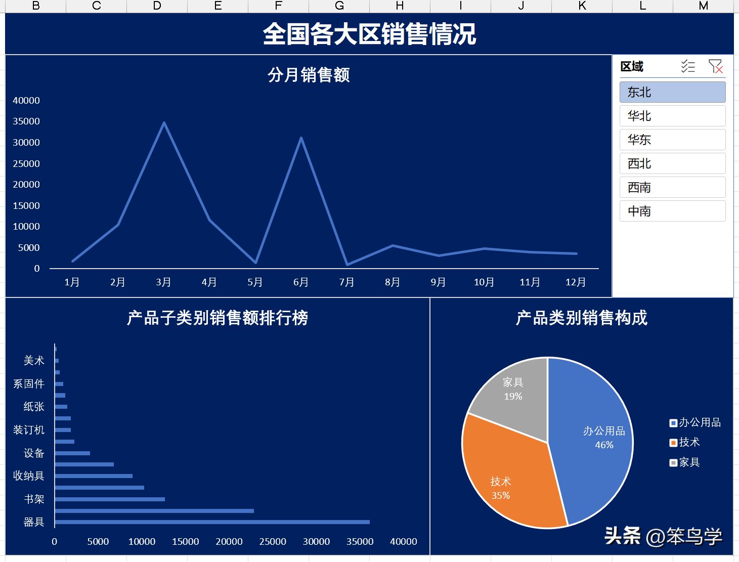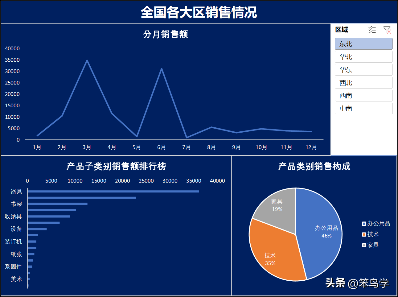 首先看看做好的数据看板,下图展示的是各大区销售情况。
