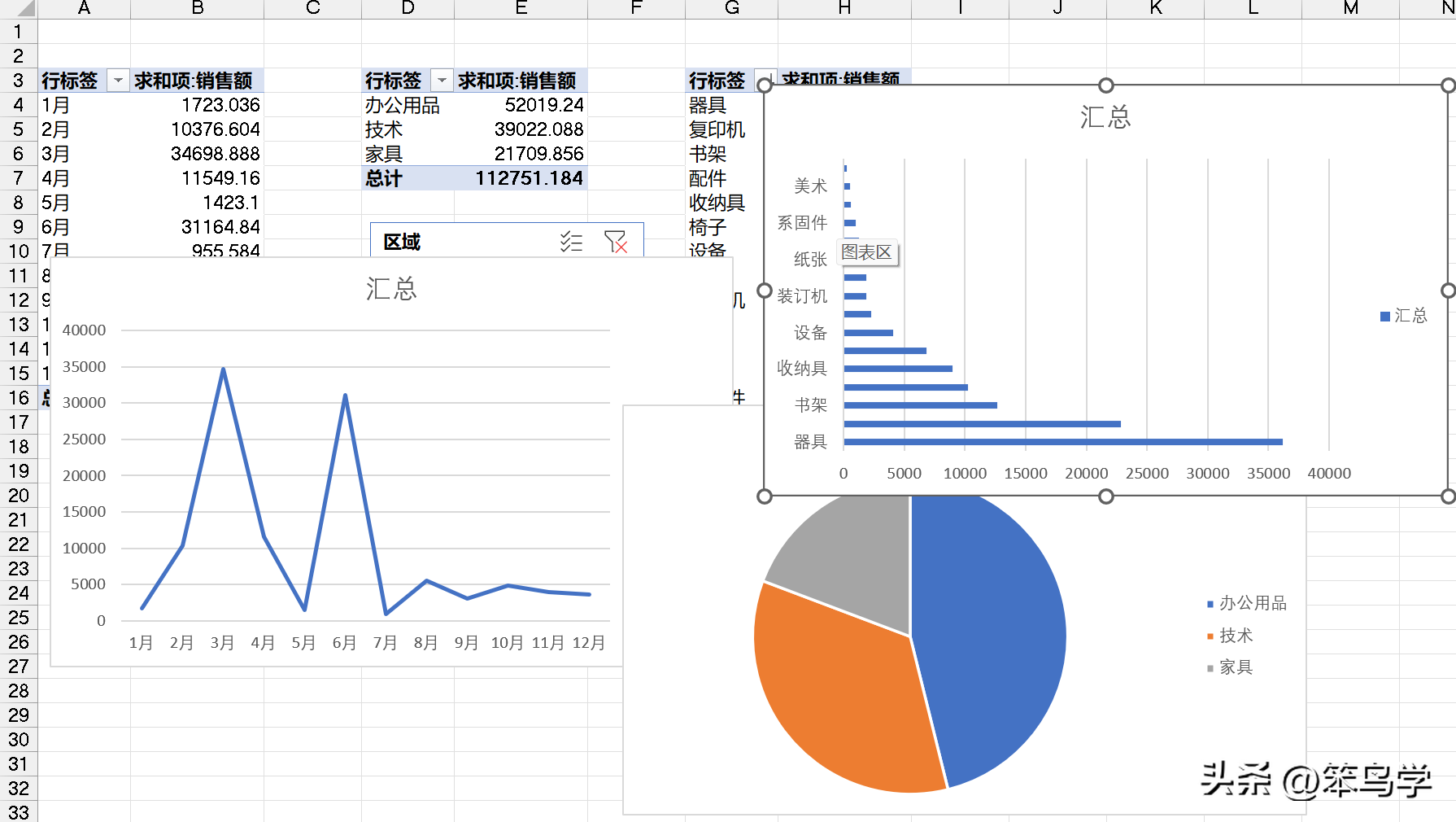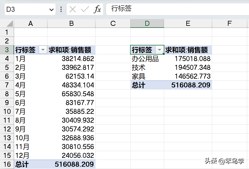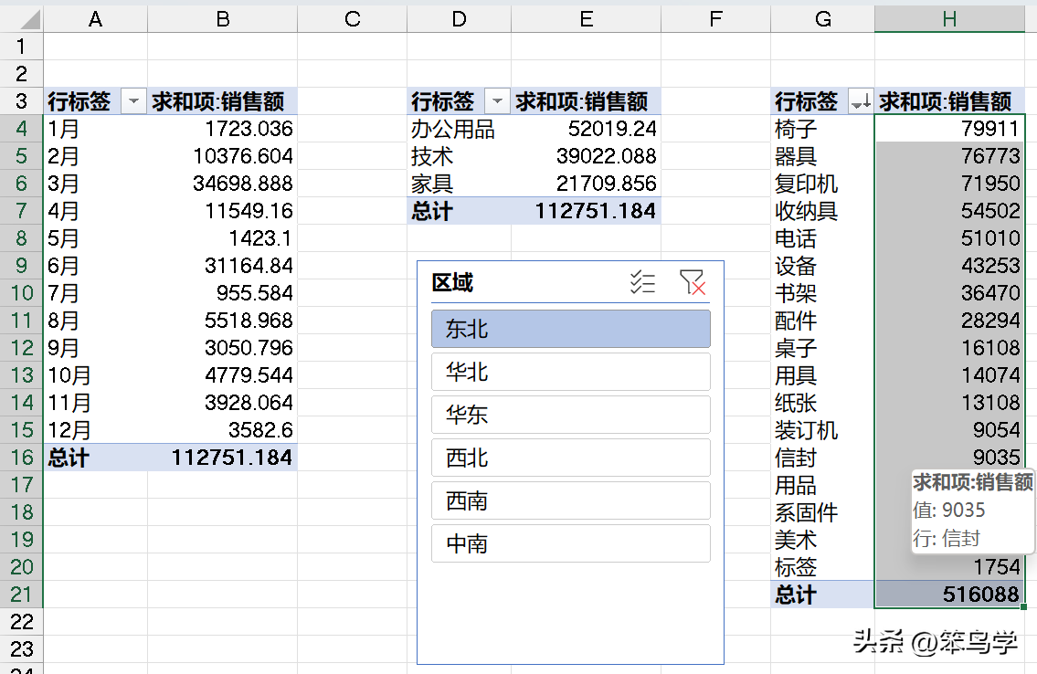 然后,用数据透视表统计出每个类别的销售额,如下图所示。