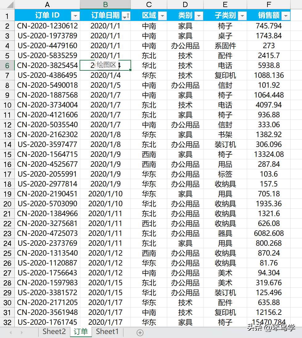 这是一个订单表,各列分别是:订单ID、订单日期、区域、类别、子类别和销售额,共有300多条记录。
