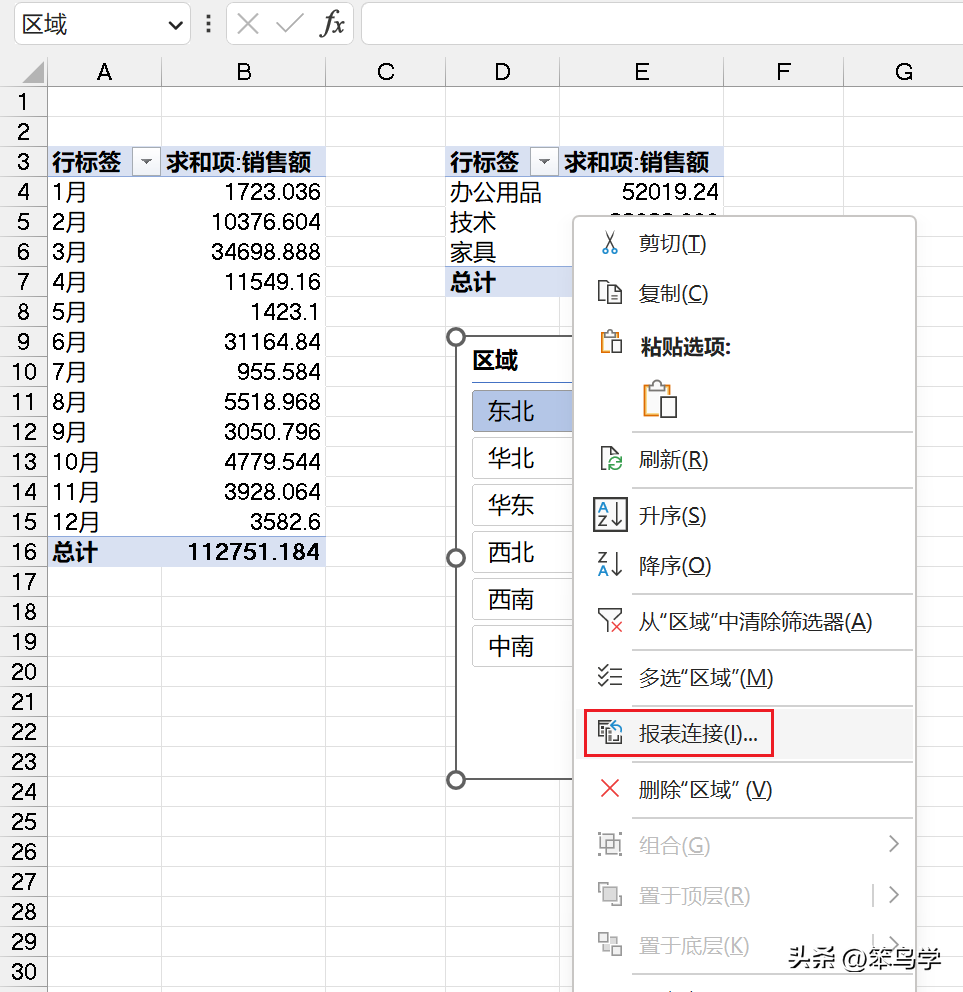 此时,切片器只能对第二个透视表起作用,在切片器上右击鼠标,选择【报表连接】。
