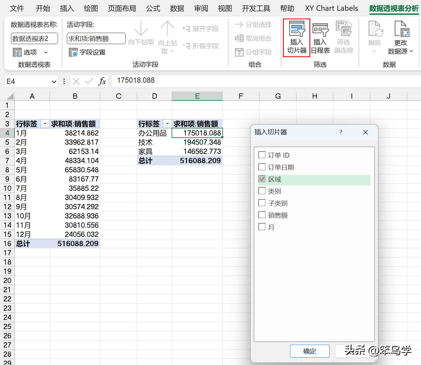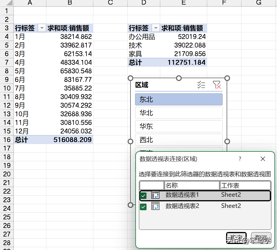 接着,选中第二个数据透视表中任意单元格,在菜单【数据透视表分析】找到【插入切片器】,插入一个切片器,选择“区域”作为筛选字段,如下图所示。