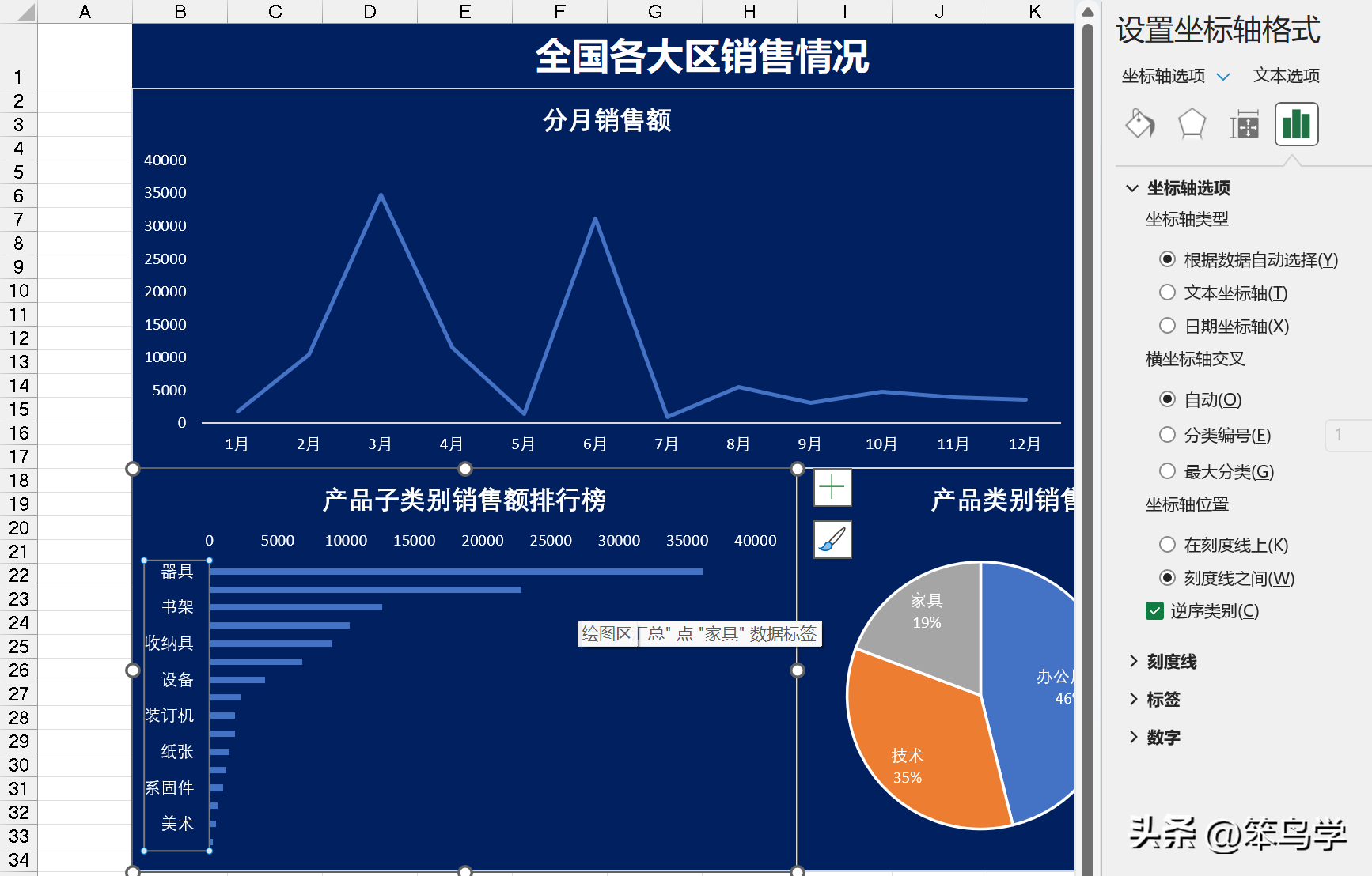 最后,调整条形图,选中纵坐标轴,右击鼠标,选择“设置坐标轴格式”,在右侧勾选【逆序类别】,即让它降序排列。