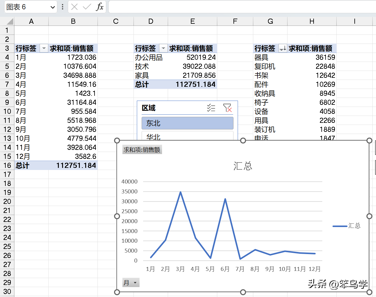 首先,对第一个数据透视表,即分月销售额,插入一个折线图,插入方式很简单,选中该透视表中任意单元格,菜单【插入】-【图表】中找到折线图,插入即可。