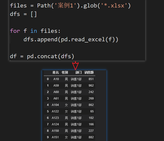 - DataFrame.assign(部门=f.stem) 是一个添加列并且返回修改后的数据的方法,特别适合这种场景下使用