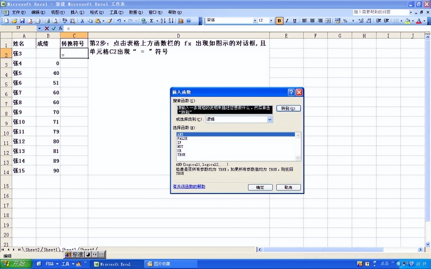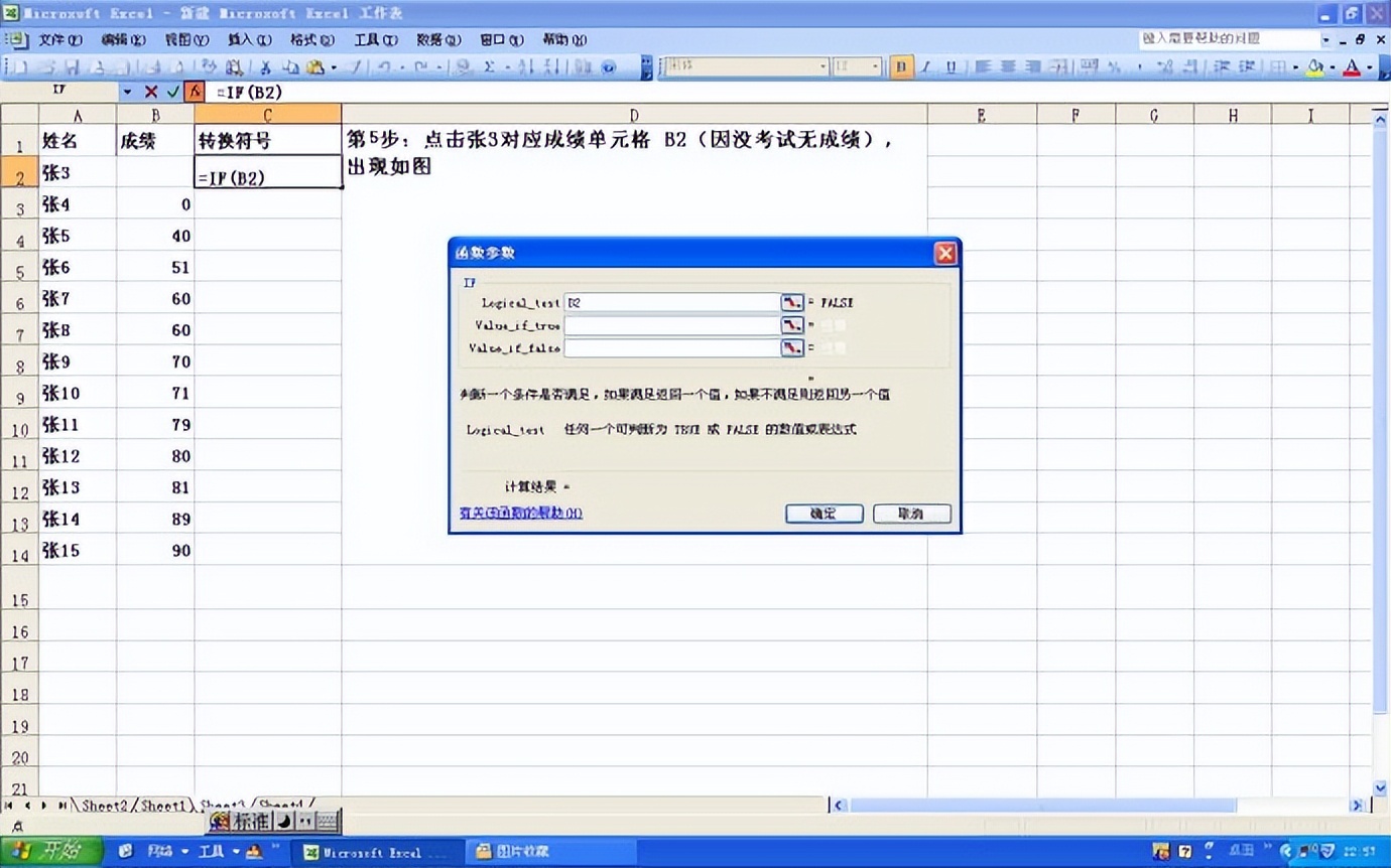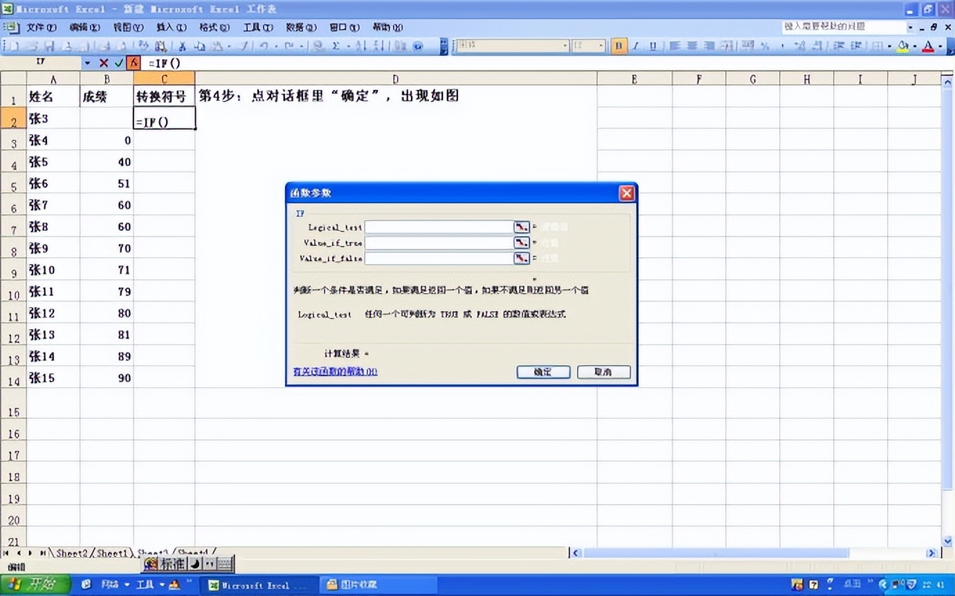 不少的统计工作要求把不同分数段转换成等级或其他代号。这时可以利用IF(逻辑判断)函数来实现。IF函数由条件、判断值、否则这3项构成,分别在函数对话框的三行里输入。可连续关联判断7次。比如,要把80-100转换成优秀,70-79转换成良好,60-69转换成合格,59以下为不合格(含无分数的单元格)。IF函数的判断过程如下,1、大于或等于80为优秀,否则转入下一判断,而下一判断的样本中是已经剔除了80分以上的,如此类推。最后一次判断是:大于或等于60为合格,否则为不合格。下面通过图片来说明操作过程。
