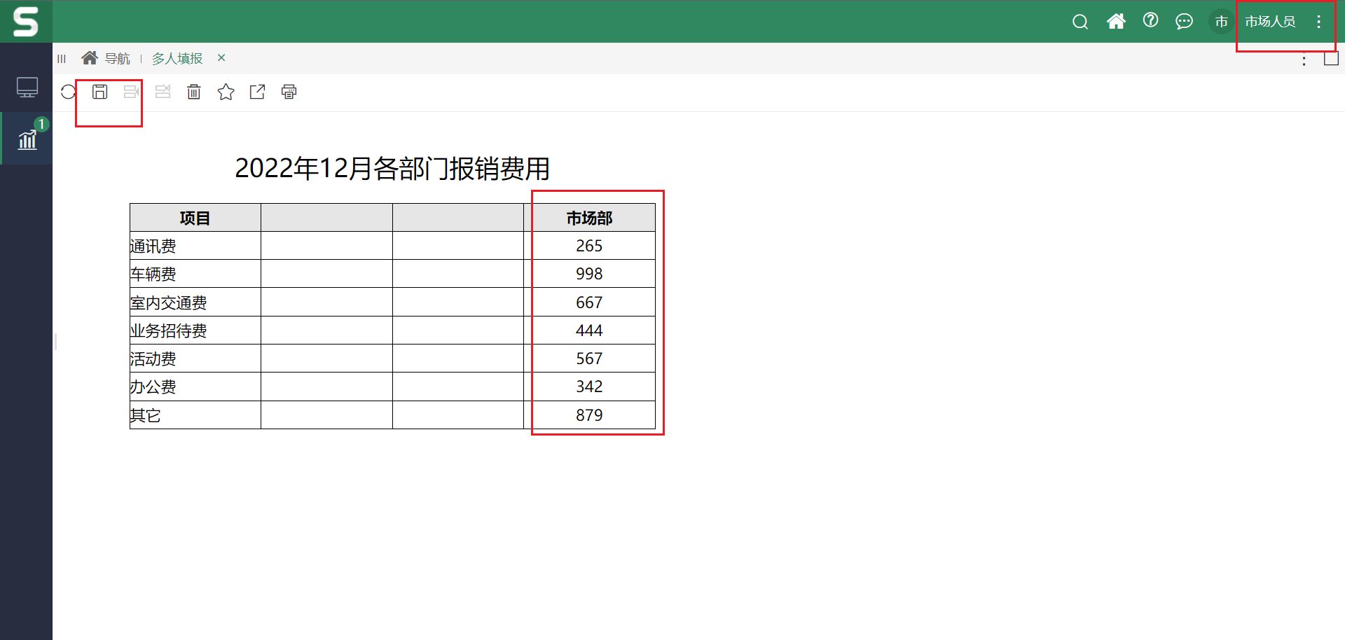 2、 市场部的填报用户登录填报市场部的报销数据: