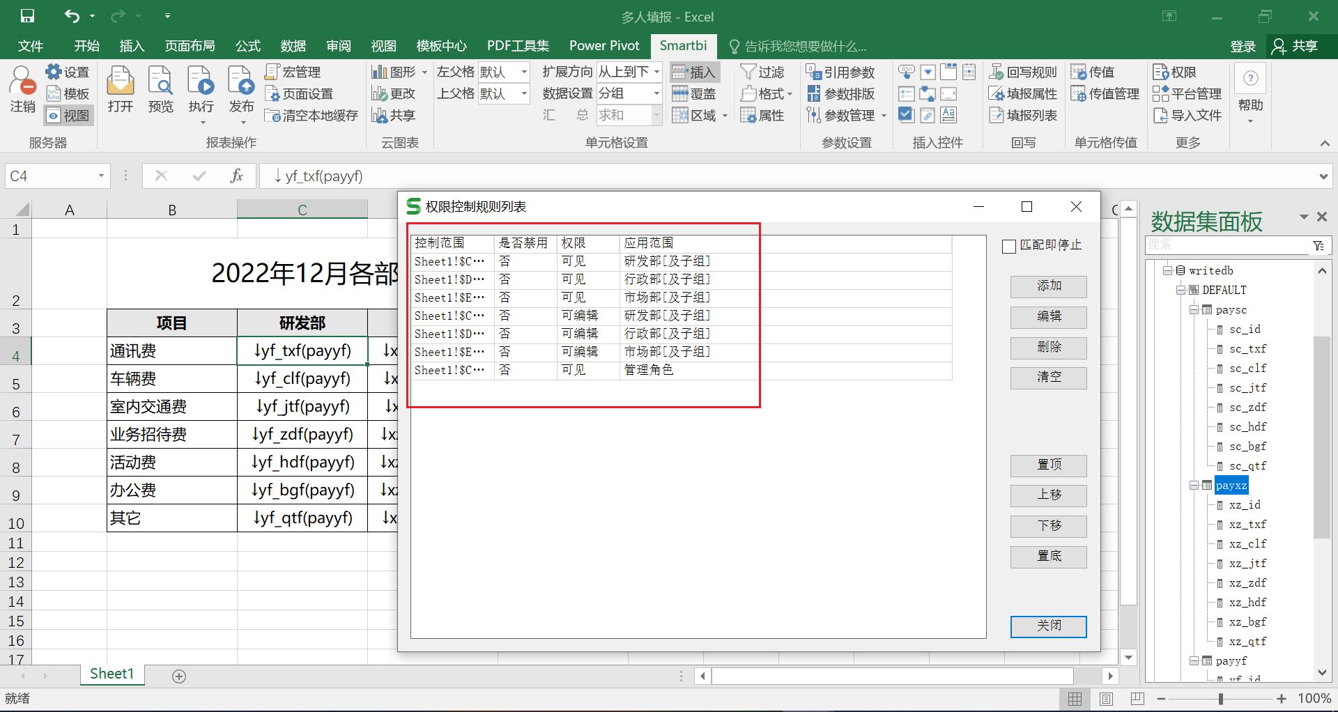 2、 设置填报的数据权限:单击电子表格设计器工具栏中的 权限列表 按钮,按照下图进行设置: