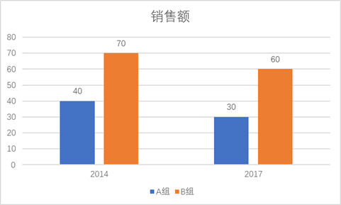 柱形图:可以横向比较A,B组数量关系。但很难看出2014与2017年总数量差异。