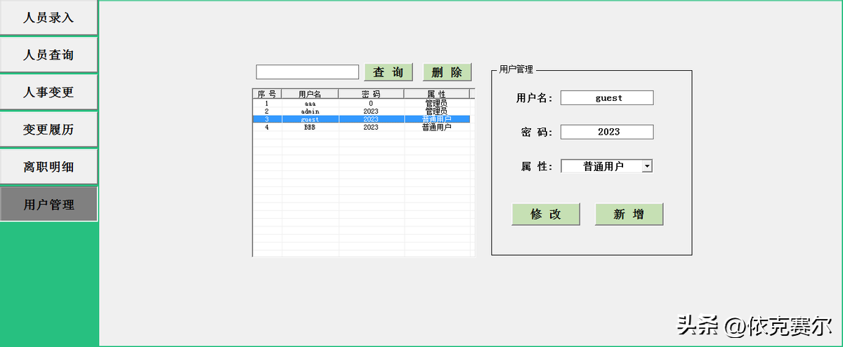 8、用户管理:在右侧点击“用户管理”按钮,可打开用户管理的界面,用户管理可修改当前系统内的所有用户的密码、属性以及删除用户等功能。