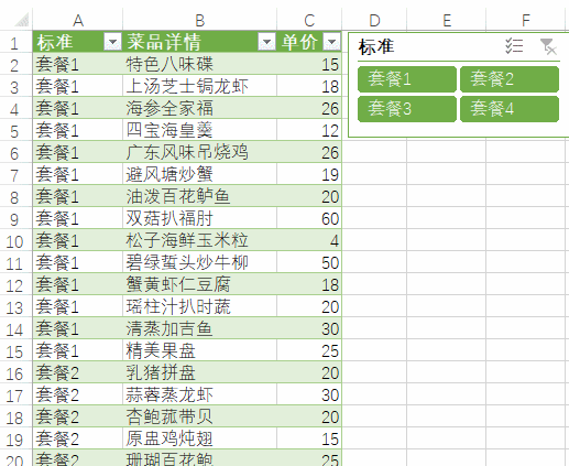 OK了,只要在切片器中单击标准名称,就会自动显示对应套餐标准的内容啦: