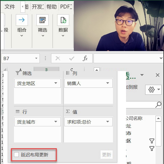 但是,您各位一定一定要取消勾选。在您的透视表布局完成后,"延迟布局更新",复选框。否则你将无法在透视表中使用排序、筛选、组合等其他功能。