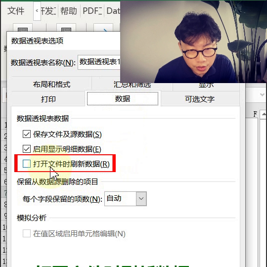 打开文件时自动刷新。我们对透视表中任意单元格单击右键,选择"数据透视表选项",在弹出的数据透视表选项,我们点击"数据"选项卡。