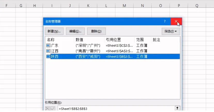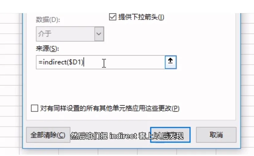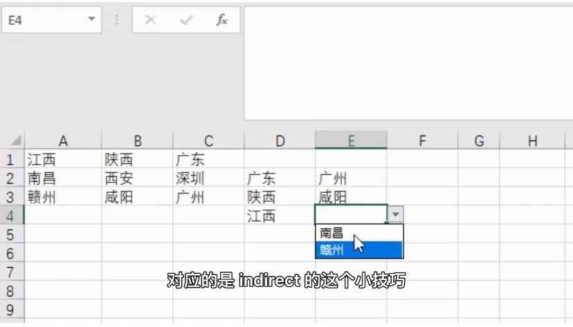 咋们再点击名称管理器可以看到,三个省份对应的市的名称都已经切定好了,然后咋们再选中E列,输入等于D1,记得杭号不能加绝对引用,不然不会往下迭代,确定以后发现,不是我们想要的结果,这是因为这里等于了左边的单元格以后,是把他当做文本处理的,所以如果要返回这个文本对应的值,也就是咋们名称管理器设定的东西,只需要套一个indirect就好了,然后咋们把indirect套上以后发现,二级下拉菜单就做好了!只会出现前面所选省份对应的市!indirect的这个小技巧,你学会了吗?关注我每天学习一个Excel小技巧~