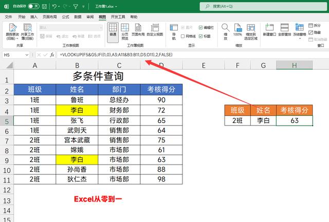 如下图,我们想要查找下2班李白的考核得分,但是1班也是有李白这个姓名的,所以就需要增加班级这个条件作为查找值。公式为:=VLOOKUP(F5&G5,IF({1,0},A3:A11&B3:B11,D3:D11),2,FALSE)