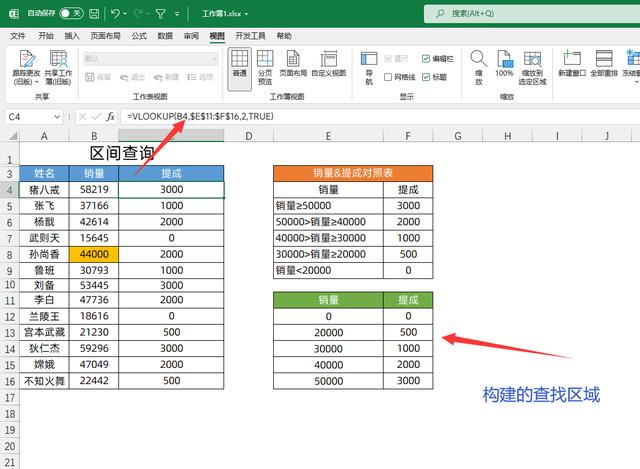 所谓的区间查询,就是一个区间对应一个结果,比如根据销量计算提成之类的问题,在这里我们需要用到vlookup的近似匹配