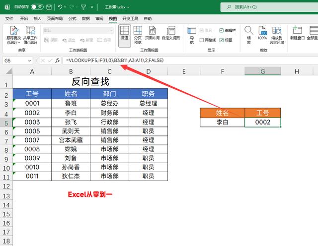 比如在这里,我们要查找李白对应的工号,这个就是一个典型的反向查找,公式为:=VLOOKUP(F5,IF({1,0},B3:B11,A3:A11),2,FALSE)