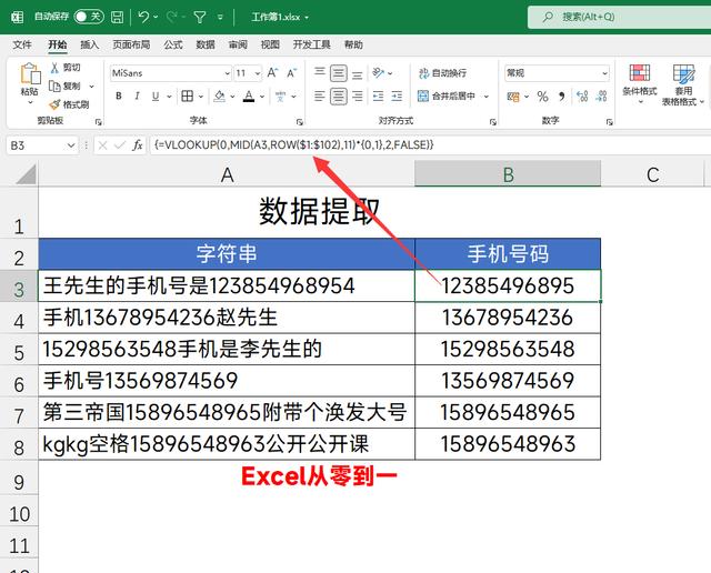 这个操作仅仅适用于从数据中提取固定长度的数值,如下图我们需要在字符串中将手机号码提取出来,只需要将公式设置为:=VLOOKUP(0,MID(A3,ROW($1:$102),11)*{0,1},2,FALSE)即可