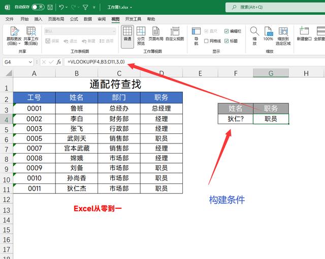 比如在这我们想要通过查找【狄仁】来返回狄仁杰的职务,只需要将查找值构建为【狄仁?】,然后使用vlookup函数进行常规查找即可