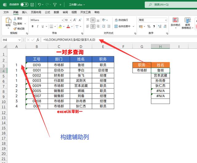 随后在H4单元格中输入:=VLOOKUP(ROW(A1),$A$2:$E$11,4,0),然后向下填充即可,看到错误值就表示查找完毕了,如果想要屏蔽错误值,可以将函数设置为:=IFERROR(VLOOKUP(ROW(A1),$A$2:$E$11,4,0),"")