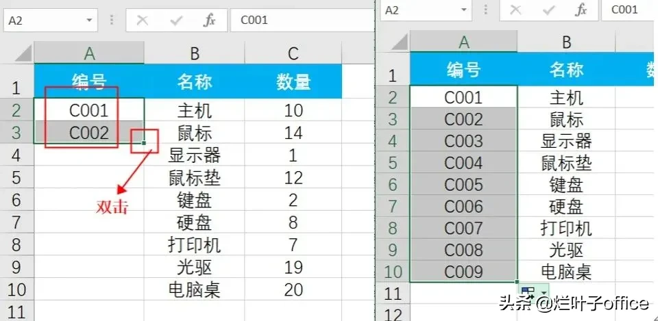 具体操作:首先选中好需要向下填充的单元格区域(这里我们需要对编号进行按顺序填充,所以选择A2:A3单元格区域),然后光标定位在选择好的单元区域右下角,当光标变成黑色十字后,左键双击,这时,不需要我们用鼠标向下拖拽,所有数据直接会全部填充,这个操作省时又省力。(如图2所示)