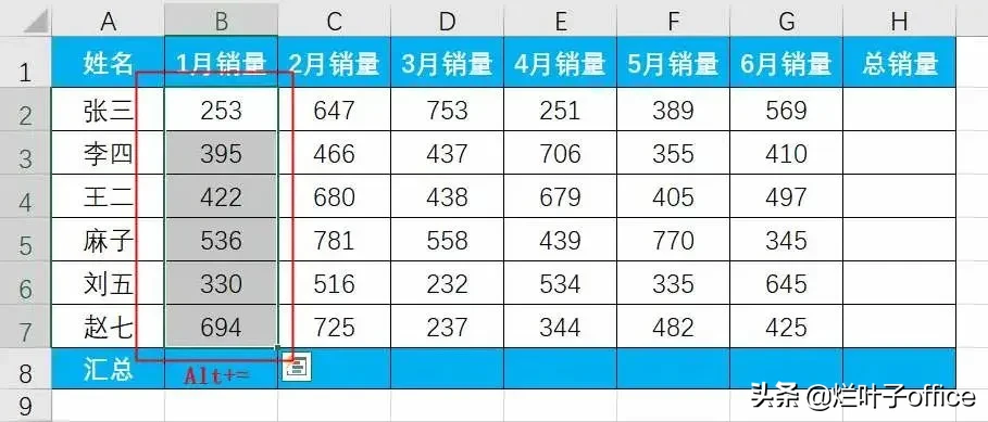 要快速求出横向数据或纵向数据之和,可以先选中该列或该行数据,然后使用快捷键【alt + =】,就能一键快速求和了!(如图3所示)