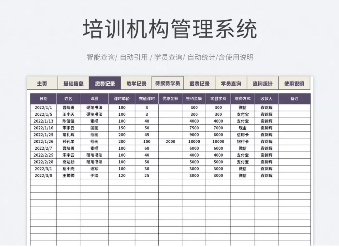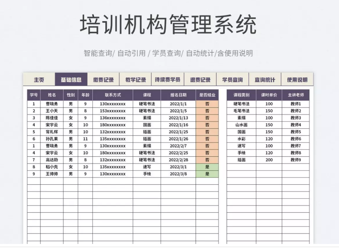 4. 使用筛选和排序:使用Excel的排序与筛选功能,可以方便地排序和筛选学员信息、课程信息、成绩记录等信息。