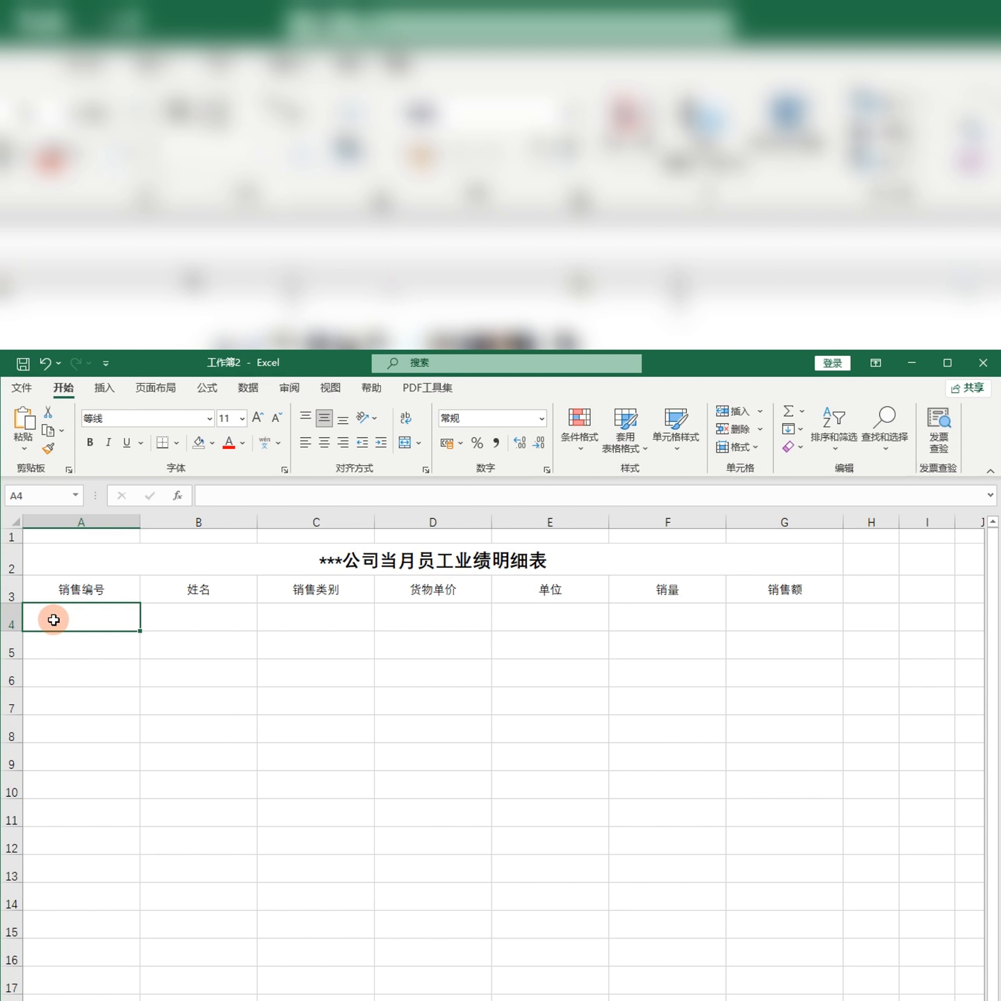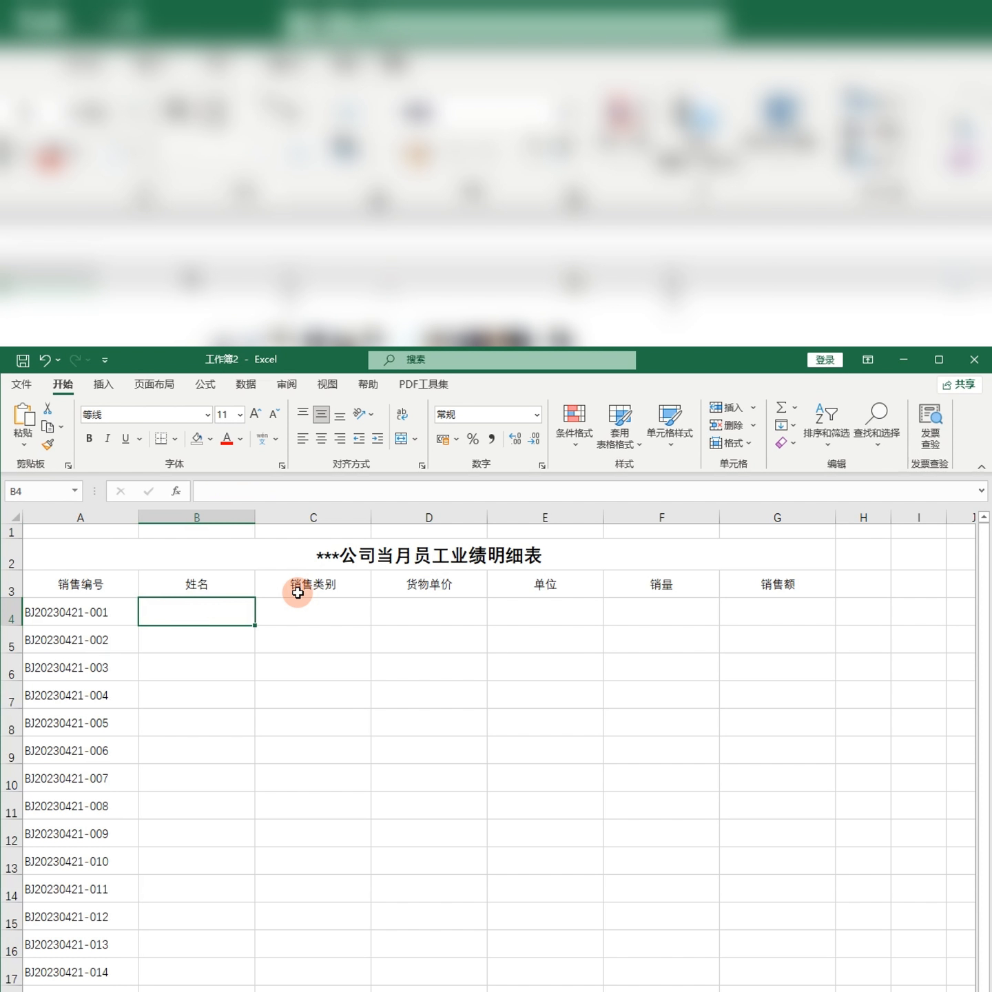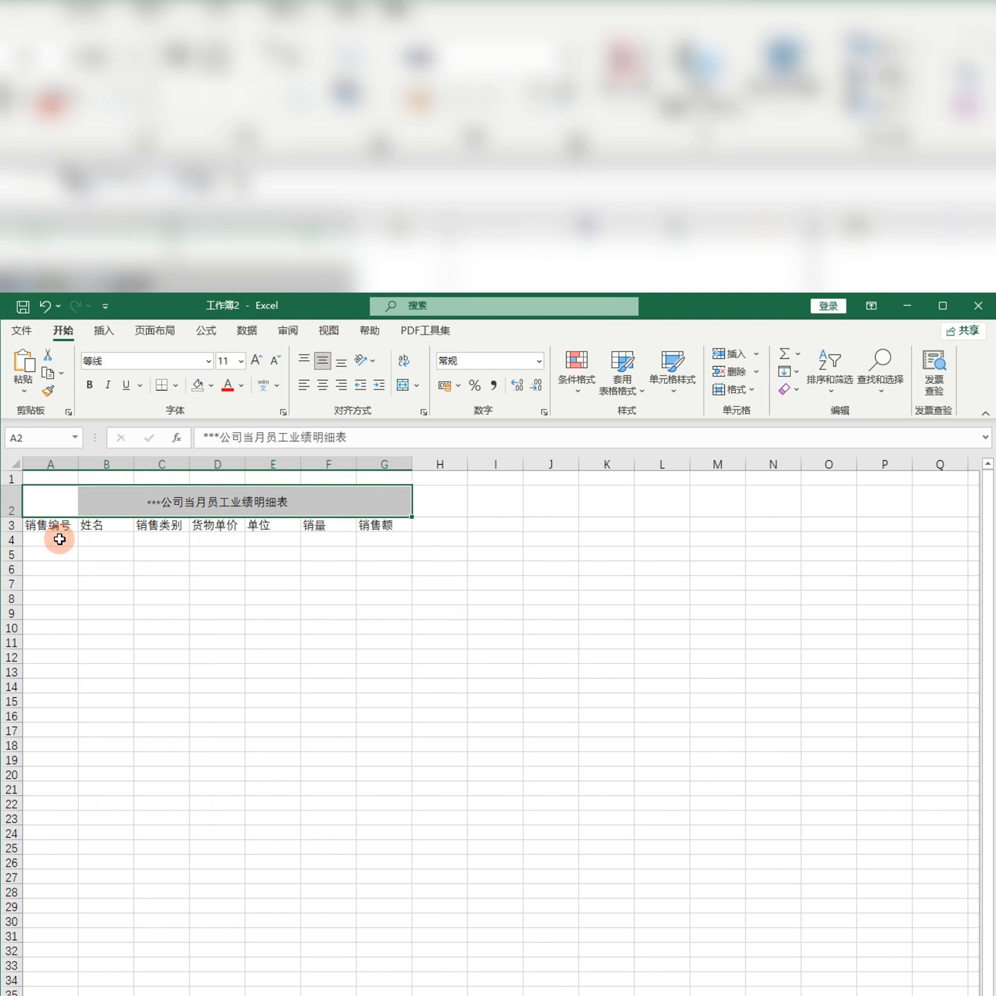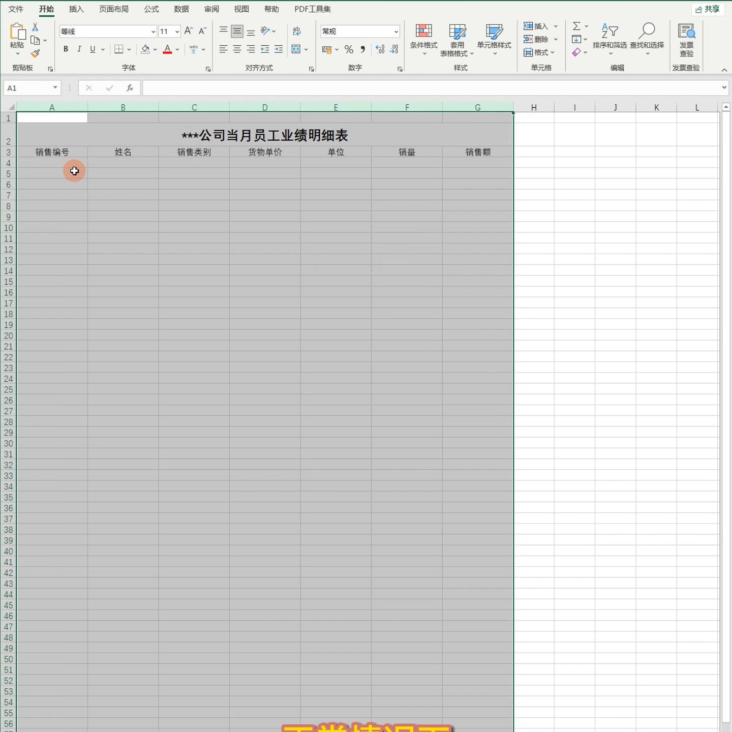 第一步新建一个工作表。给它设置一个标题:某某某公司当月员工业绩明细表。然后下一步是开始设置每一列的字段名称,例如销售编号。输入完之后我们可以按tab键,它就可以跳到右边的这个单元格里面。继续输入姓名,我们要从表格里明确看出是公司里哪个人卖的对不对?然后输入销售类别,再输入货物单价,继续输入单价、销量、销售额。
