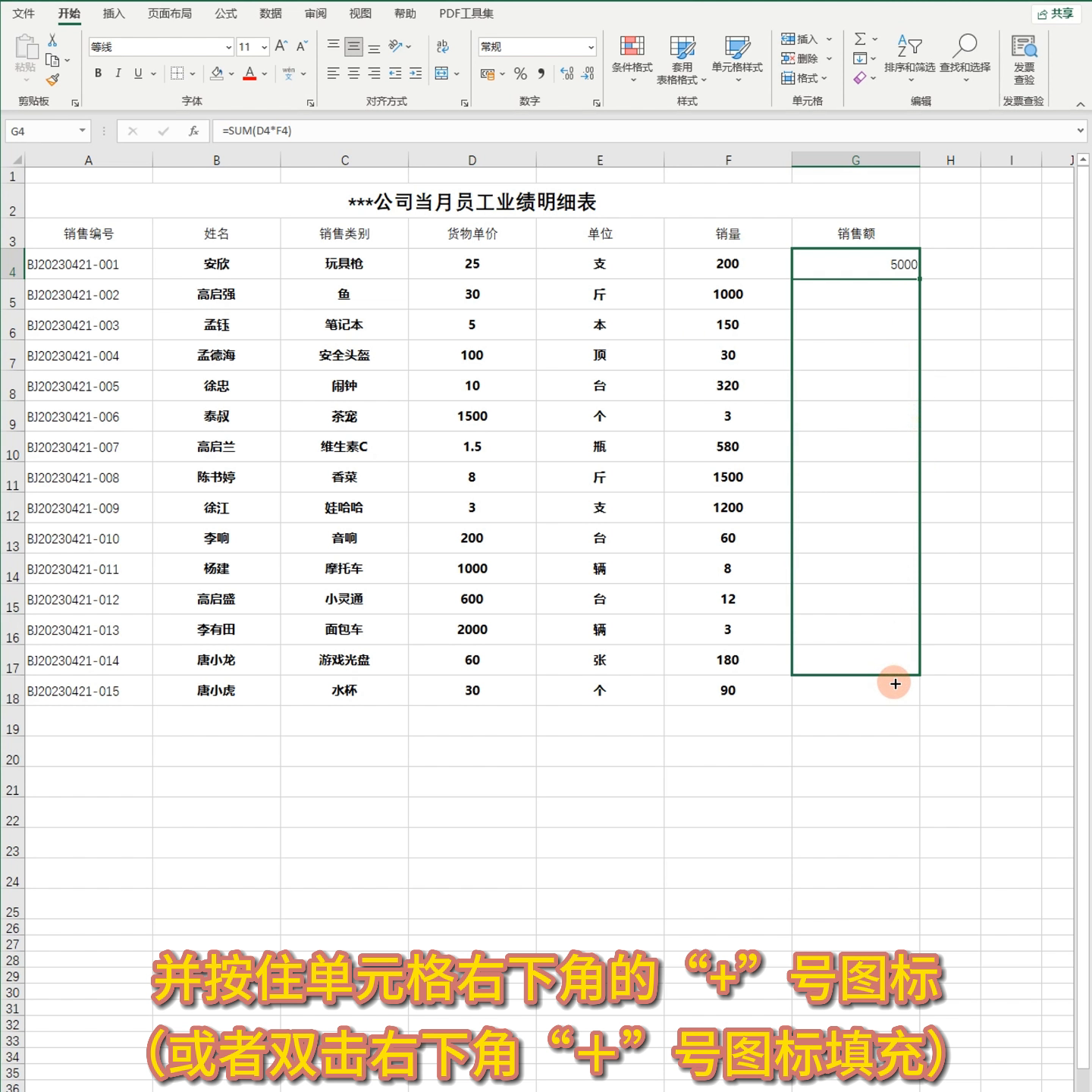 再次点击这一行的销量,回车,该单元格就计算出正确的销售额了。最后点击刚才的单元格,鼠标左键点击,并按住单元格右下角的(或者双击右下角"十"号图标填充),向下拖动这一列的销售额,数据就全部计算出来了。
