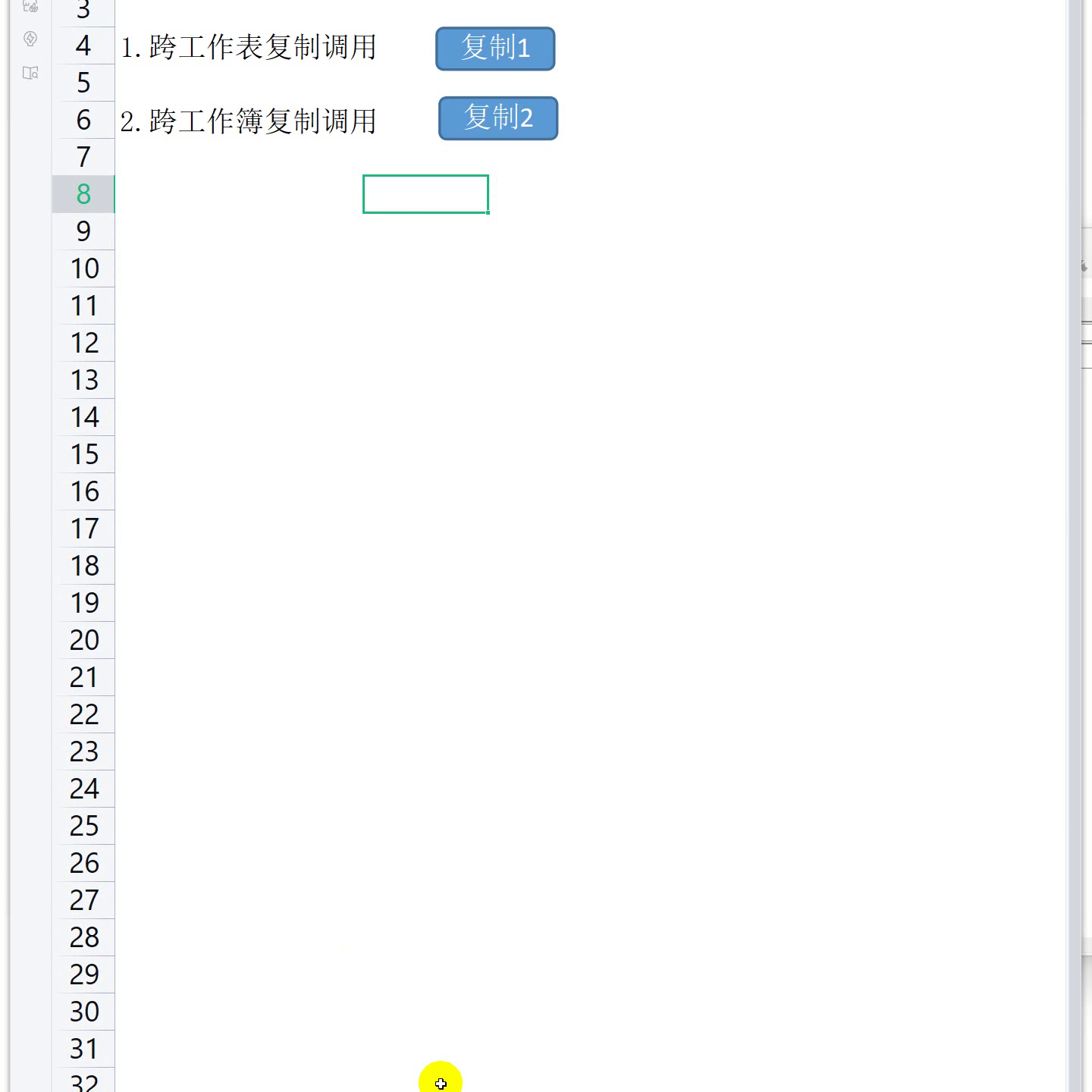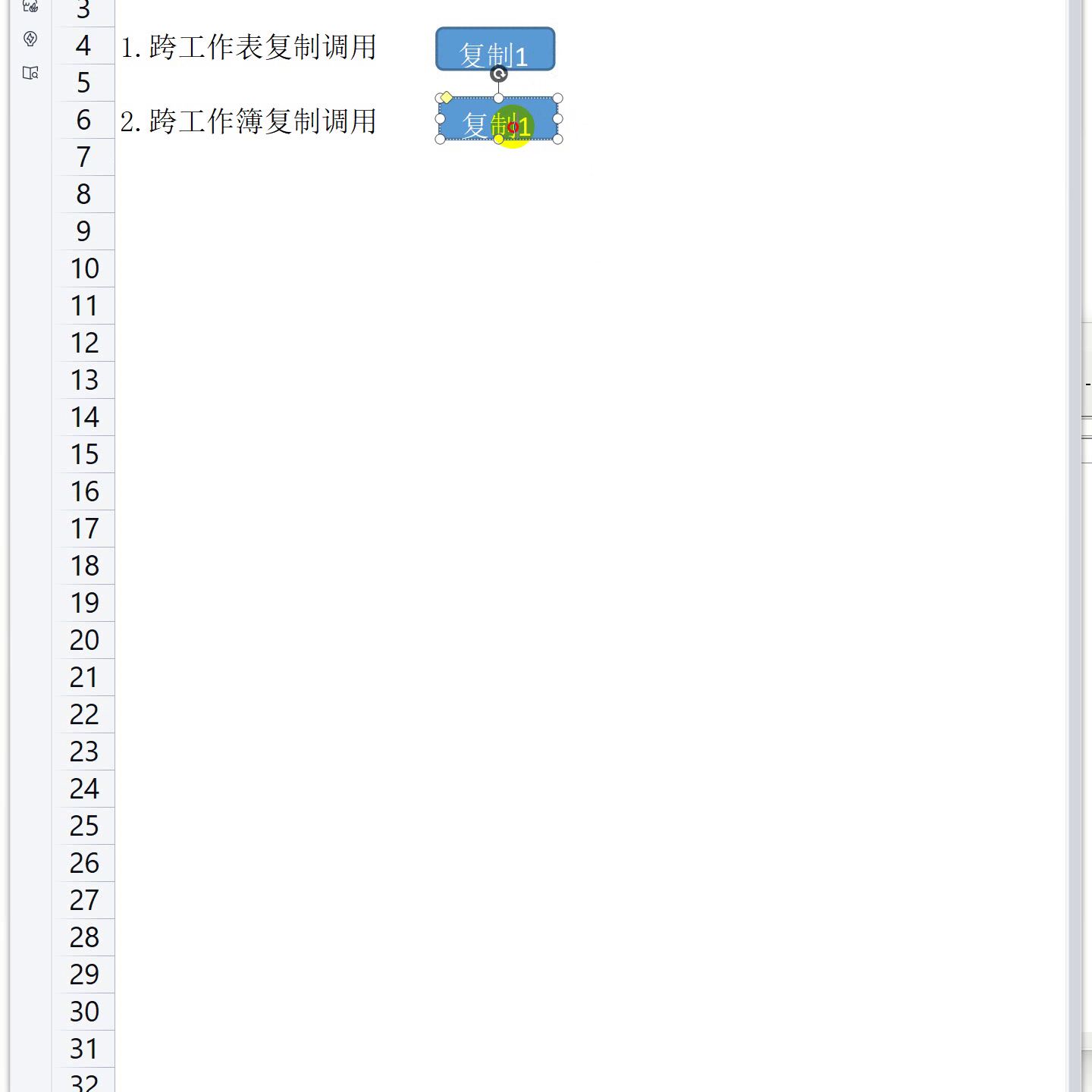 ·这里时候在跨表复制这里,我们去插入一新的模块,来斜一下这个鄂。第一个跨工作表复制。这个鄂就是这样写,一个sum,一个写个宏名称。那这里的时候我们做插入两个形状,插入两个形状做一测试。第一个叫做复制一,然后再复制一个,这个叫复制二。一个是跨表,一个是跨工作部的由上,这两个实际上就做了两个命令按钮,然后通过它去执行。