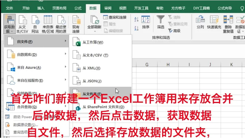首先咋们新建一个Excel工作簿用来存放合并后的数据,然后点击数据,获取数据,自文件,然后选择存放数据的文件夹,