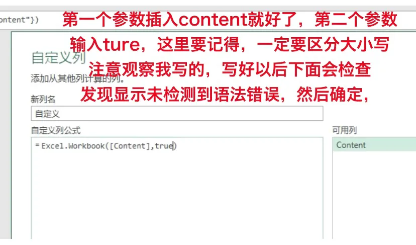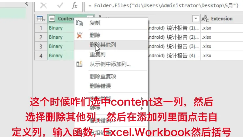 这个时候咋们选中content这一列,然后选择删除其他列,然后在添加列里面点击自定义列,输入函数,Excel.Workbook然后括号
