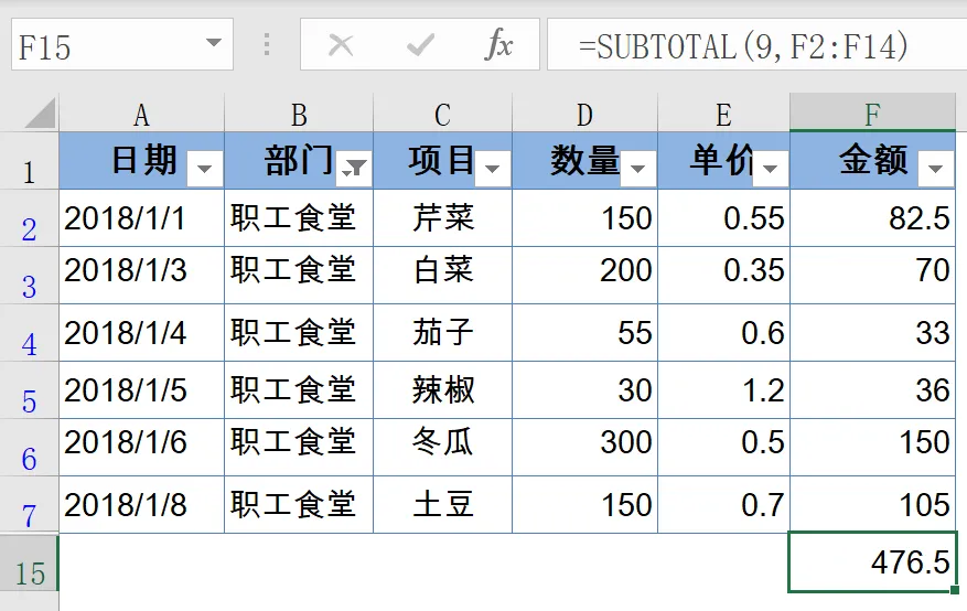 =SUBTOTAL(9,F2:F14)