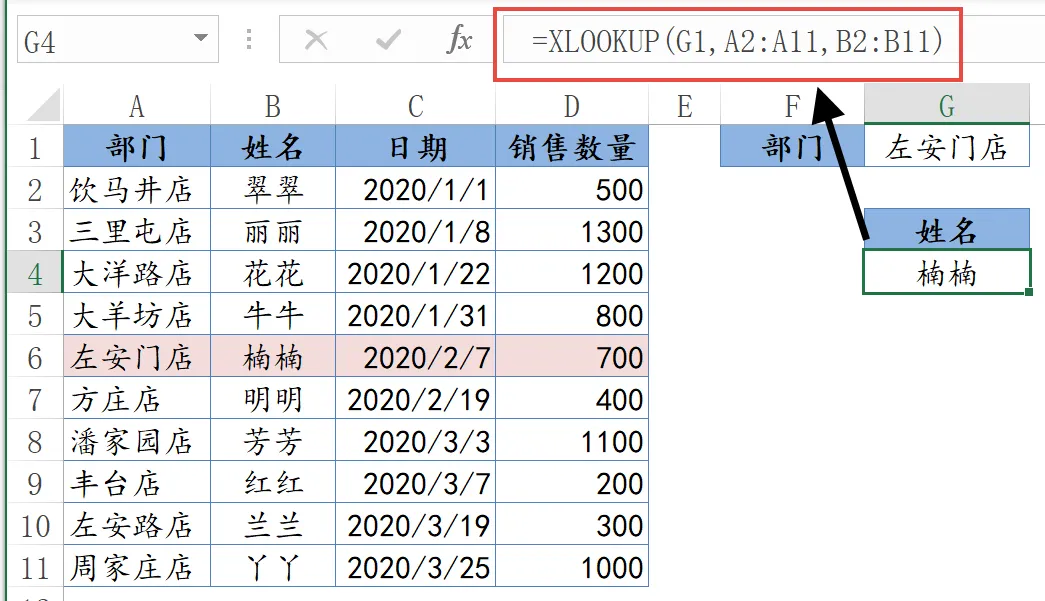 公式的意思就是在A2:A11单元格区域中查找G1单元格指定的部门,并返回B2:B11单元格区域中与之对应的姓名。