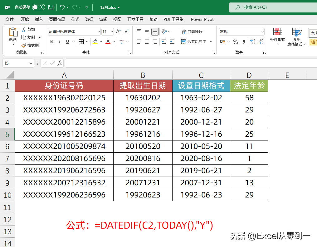 3.计算法定年龄:=DATEDIF(C2,TODAY(),"Y"),DATEDIF是专门用来计算日期差值的函数,将第三参数设置为Y,就表示计算年的差值
