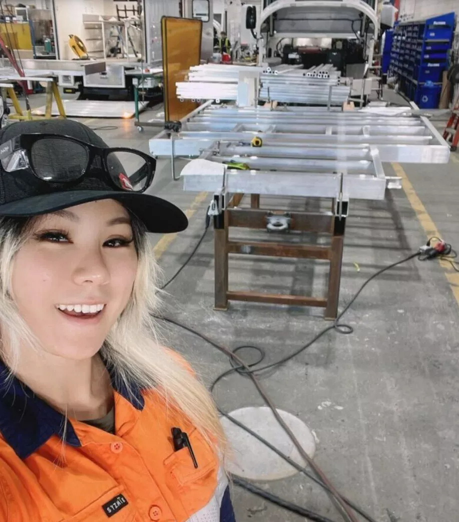在加拿大BC省的一个冰冷的车间里,一位30岁左右的女生正在切割铝板,金属火花四溅,响亮的钻孔声持续不断。这些切割好的框架最终会安装在卡车底盘上。而在黑色的电焊头盔后面,是一张华裔女生的面孔,她就是莫妮克·宋(Monique Song)。