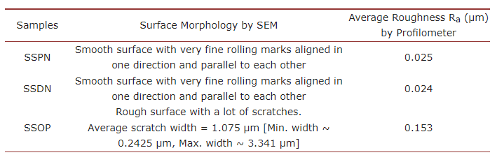 展示了SSPN、SSDN和SSOP的代表性样品的扫描电镜图像。从这些显微图中可以清楚地看出,新的面板(SSPN)和碟子(SSDN)表面相对光滑,有细微的滚动印记和偶尔的缺陷或划痕。滚动印记是不锈钢表面经过抛光过程形成的结果。