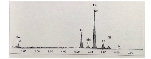 使用能量色散X射线光谱仪(EDX)对样品进行了批量化学成分的研究。显示了3组板材的化学成分数据,以及通过EDX技术确定的标准SS-304成分。