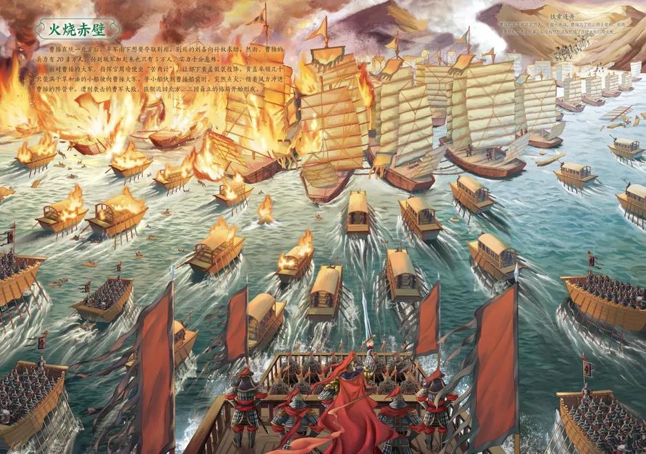 比如历史上有名的赤壁之战,从下图中就能非常震撼、直观感受“火烧赤壁”的场面,理解曹操的“铁索连舟”为何会以大败收场。