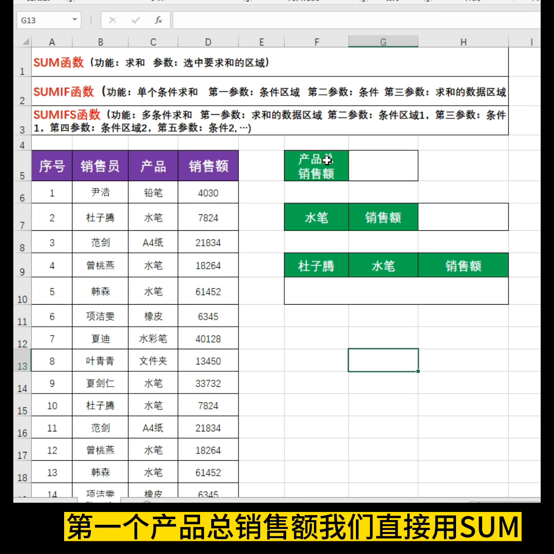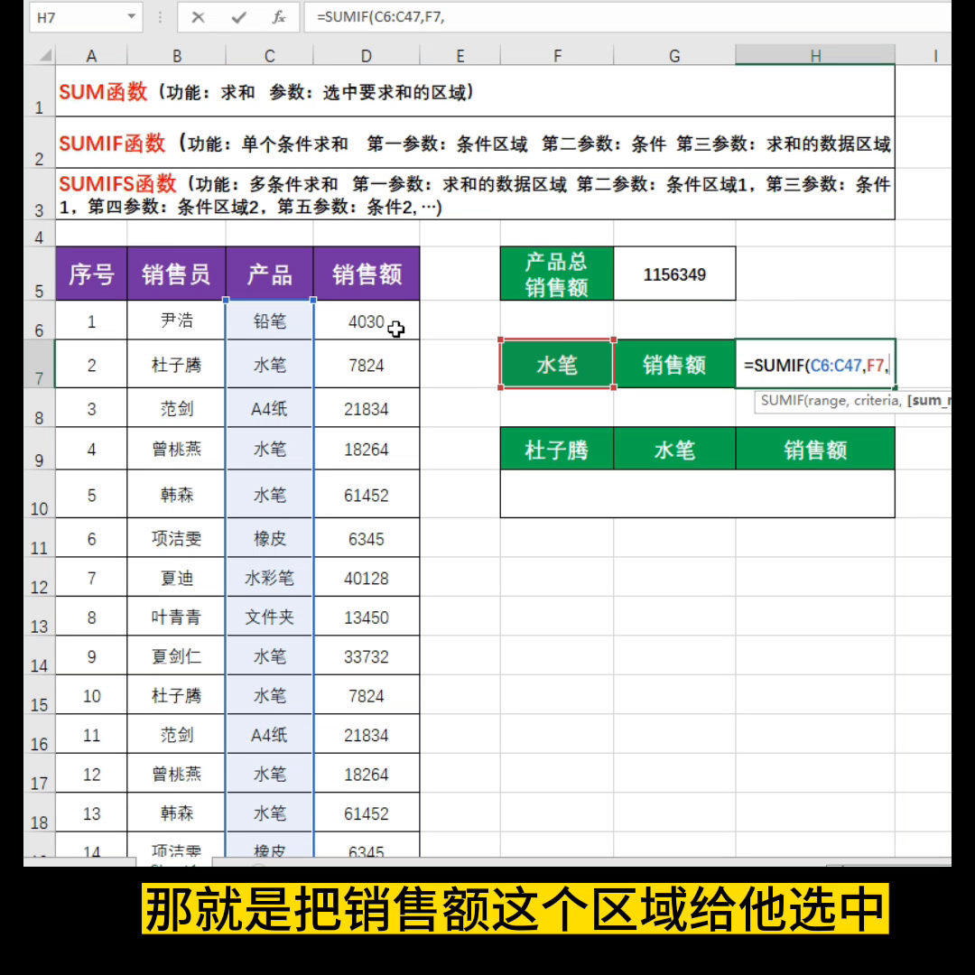 接下来它让我们求水笔的销售额,就是有条件了。有一个条件条件就是水笔,水笔的销售额。我们这里可以用sum if,单条件求和等于sum if。这个函数它有三个参数,第一参数条件区域。就是说条件水笔,这个条件它是在哪个区域查找,我们选中产品这个区域,输入英文状态下的逗号,第二条件第二参数条件,就是水笔这个条件。