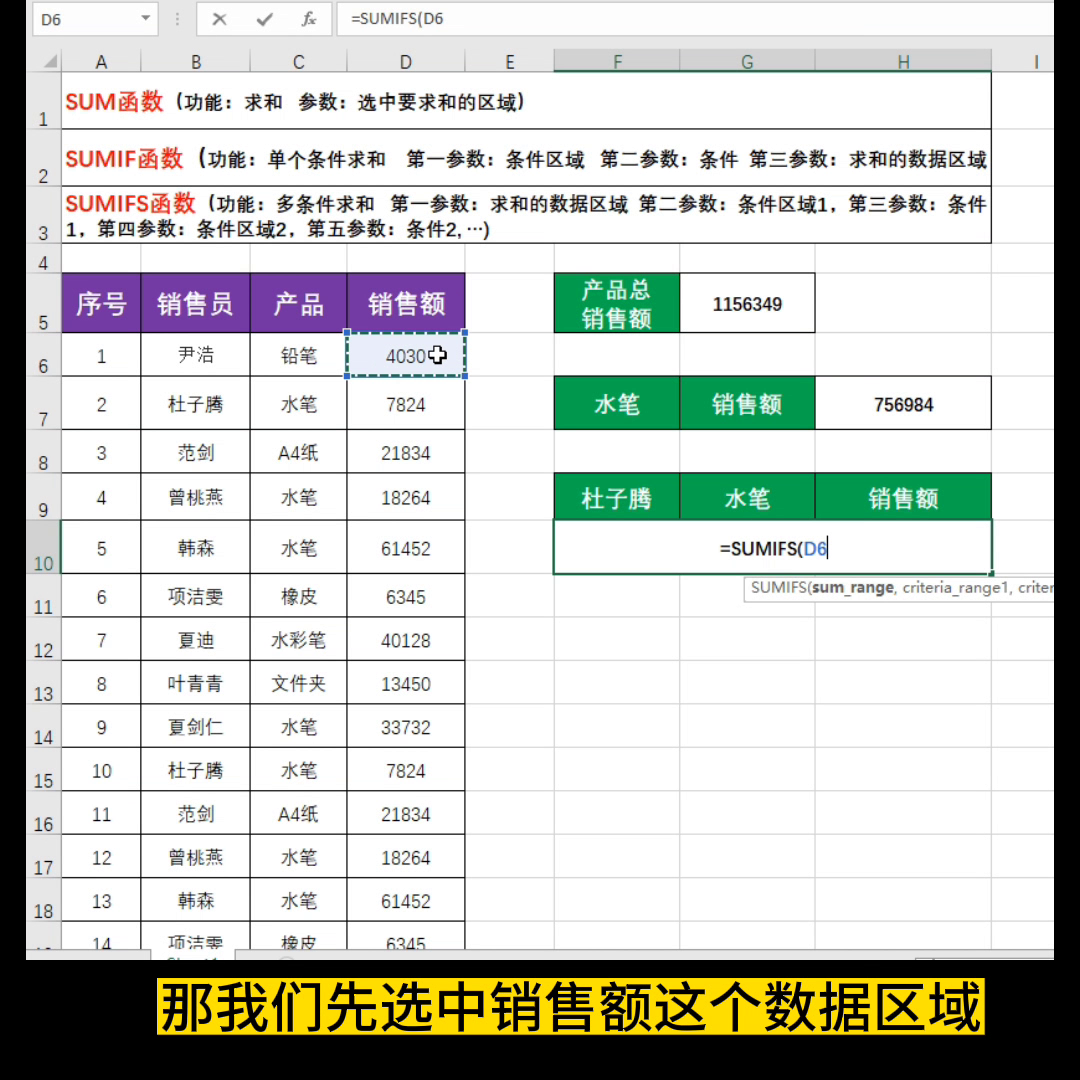 函数SUMIFS等于第一参数求和的数据区域。我们先选中销售额这个数据区域,第二参数条件区域1。就是说第一个条件,他要在哪个区域查找,在销售员这个区域查找,我们选中第一个区域,输入逗号三参数条件1,那就是第一条件,杜子腾这个员工直接选中这个单元格,逗号第四参数条件区域2,那就是第二条件随笔在哪个区域查找,在产品这个区域查找,我们选中这个区域。