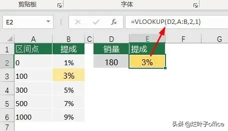 如下图所示查找180,在A列查找比180且最接近的值是100,返回100对应的提成3%。