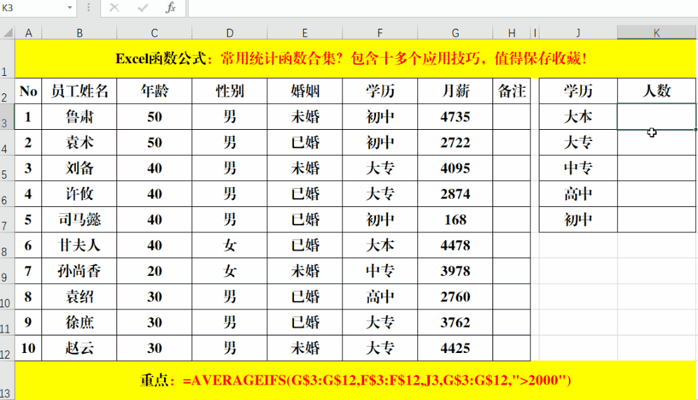 目的:按学历计算平均月薪。