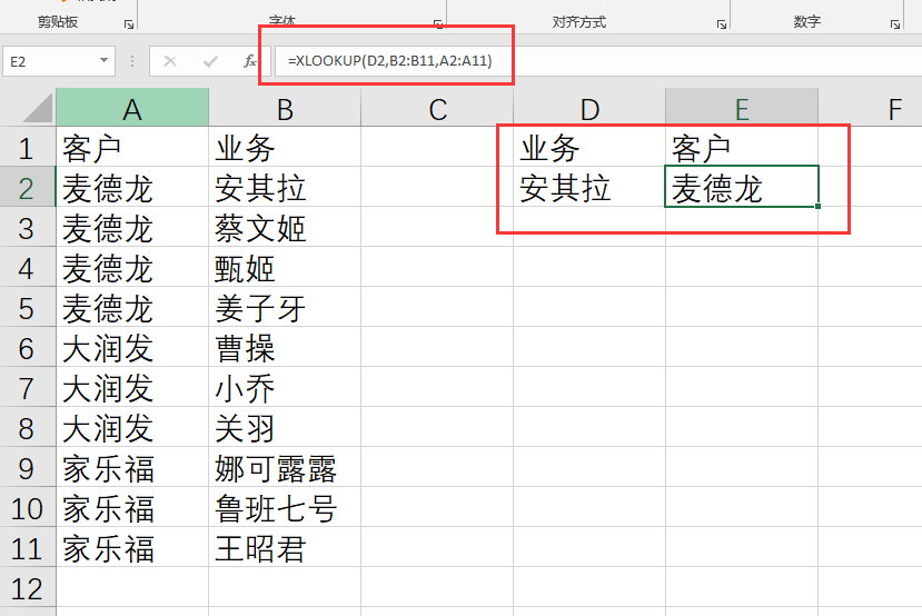 2.反向引用: XLOOKUP 图2: =XLOOKUP(D2,B2:B11,A2:A11)