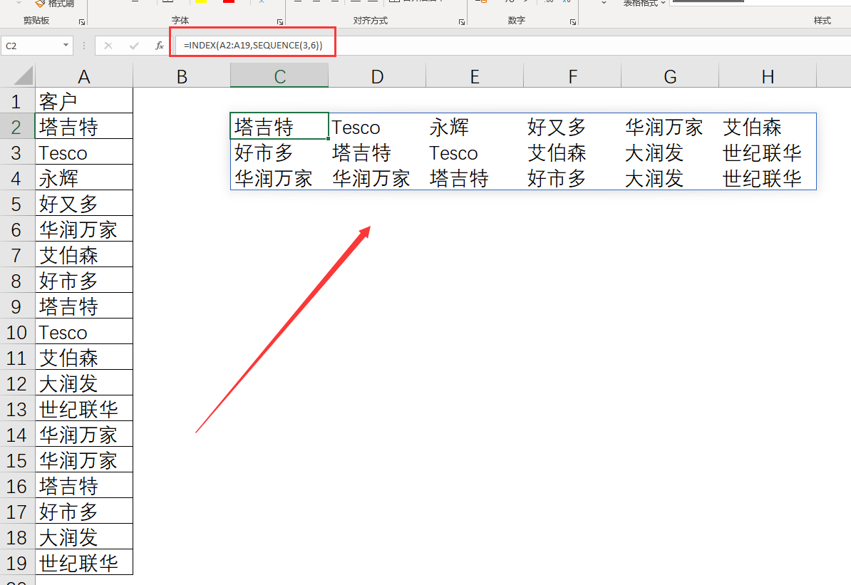 7.1列分拆多列:SEQUENCE 图7 =INDEX(A2:A19,SEQUENCE(3,6)) 图7