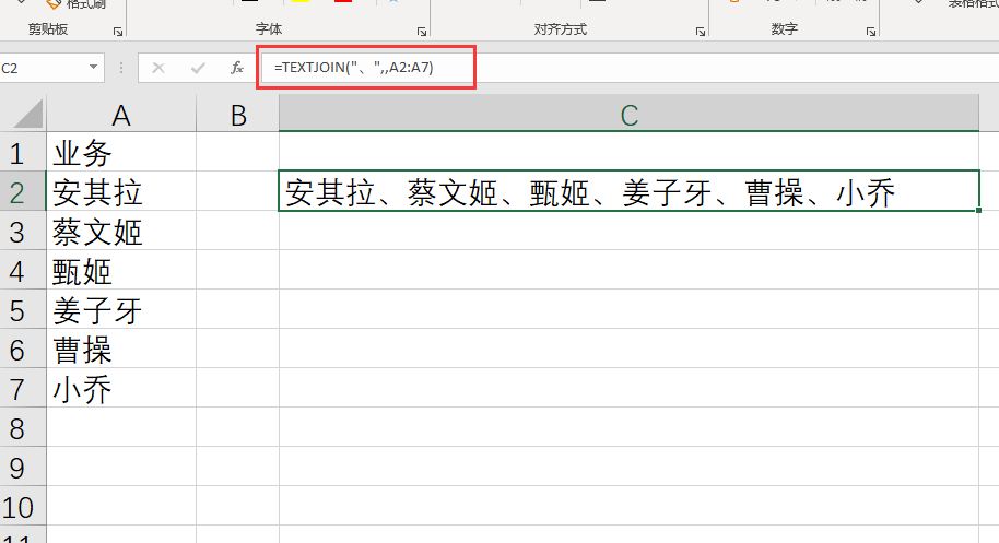 5.多单元格合并:TEXTJOIN 图5=TEXTJOIN("、",,A2:A7)