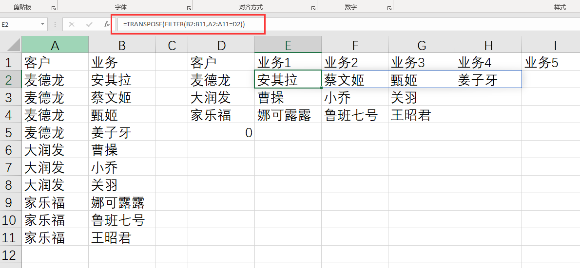 4.一对多引用:FILTER 图4:=TRANSPOSE(FILTER(B2:B11,A2:A11=D2))